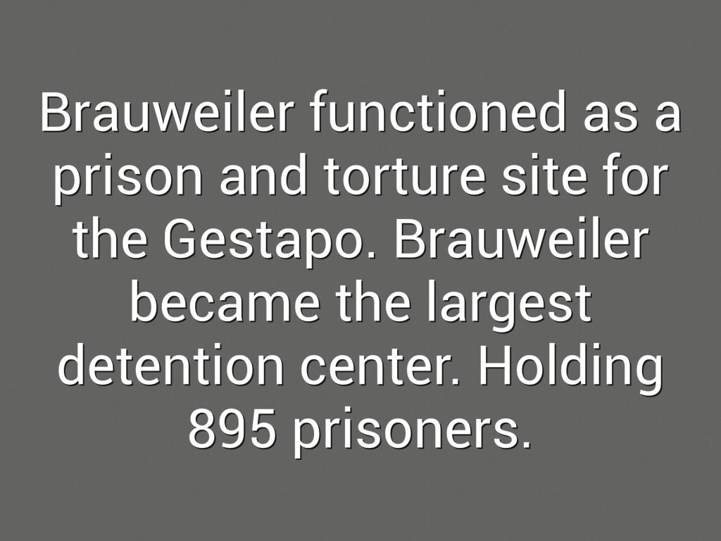 Brauweiler functioned as a prison and torture site for the Gestapo. Brauweiler became the largest detention center. Holding 895 prisoners.