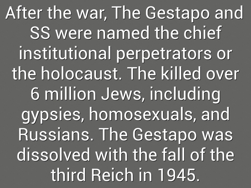 After the war, The Gestapo and SS were named the chief institutional perpetrators or the holocaust. The killed over 6 million Jews, including gypsies, homosexuals, and Russians. The Gestapo was dissolved with the fall of the third Reich in 1945.