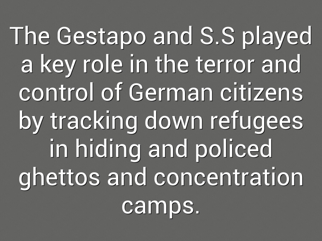 The Gestapo and S.S played a key role in the terror and control of German citizens by tracking down refugees in hiding and policed ghettos and concentration camps.