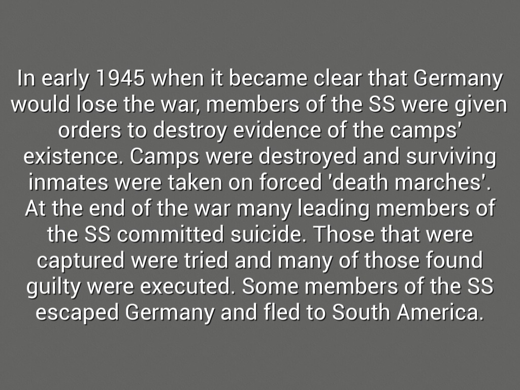 At the end of the war many leading members of the SS committed suicide. Those that were captured were tried and many of those found guilty were executed. Some members of the SS escaped Germany and fled to South America.