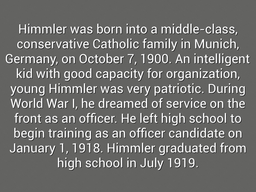 Himmler was born into a middle-class, conservative Catholic family in Munich, Germany, on October 7, 1900. An intelligent kid with good capacity for organization, young Himmler was very patriotic. During World War I, he dreamed of service on the front as an officer. He left high school to begin training as an officer candidate on January 1, 1918. Himmler graduated from high school in July 1919.