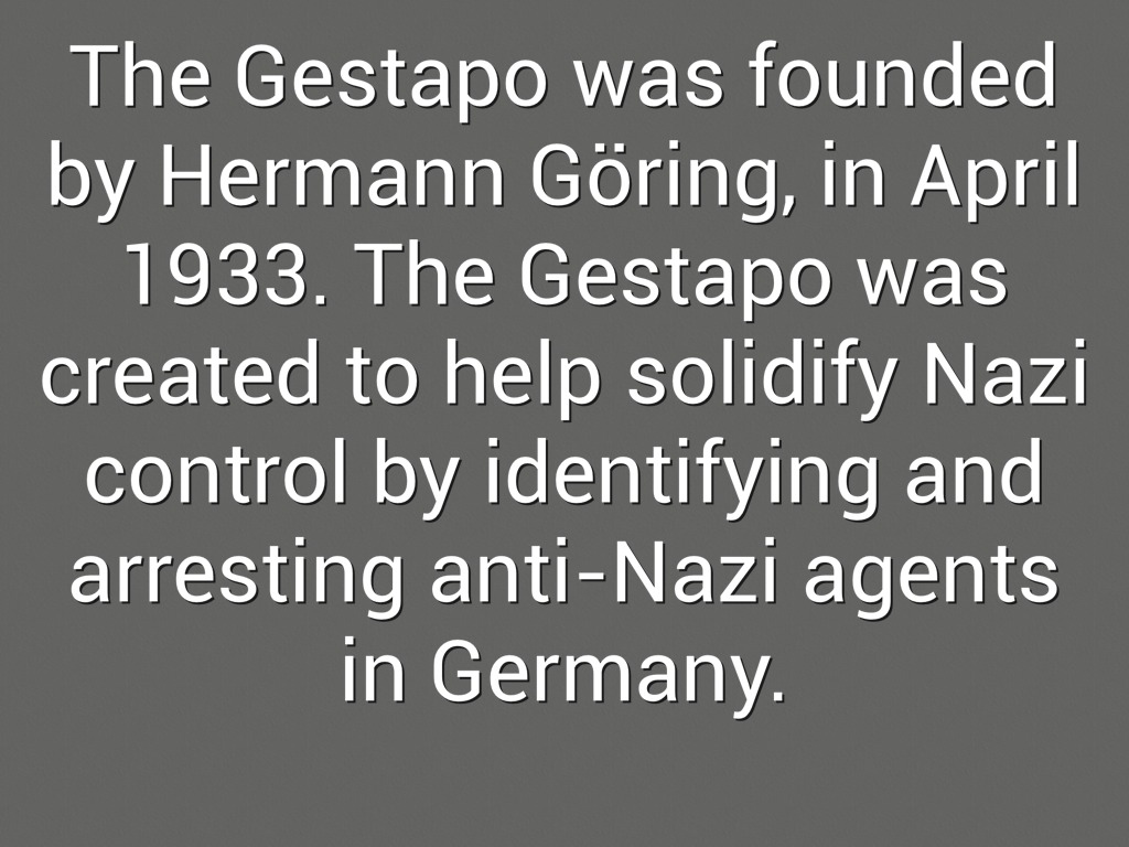 The Gestapo was founded by Hermann Göring, in April 1933. The Gestapo was created to help solidify Nazi control by identifying and arresting anti-Nazi agents in Germany.