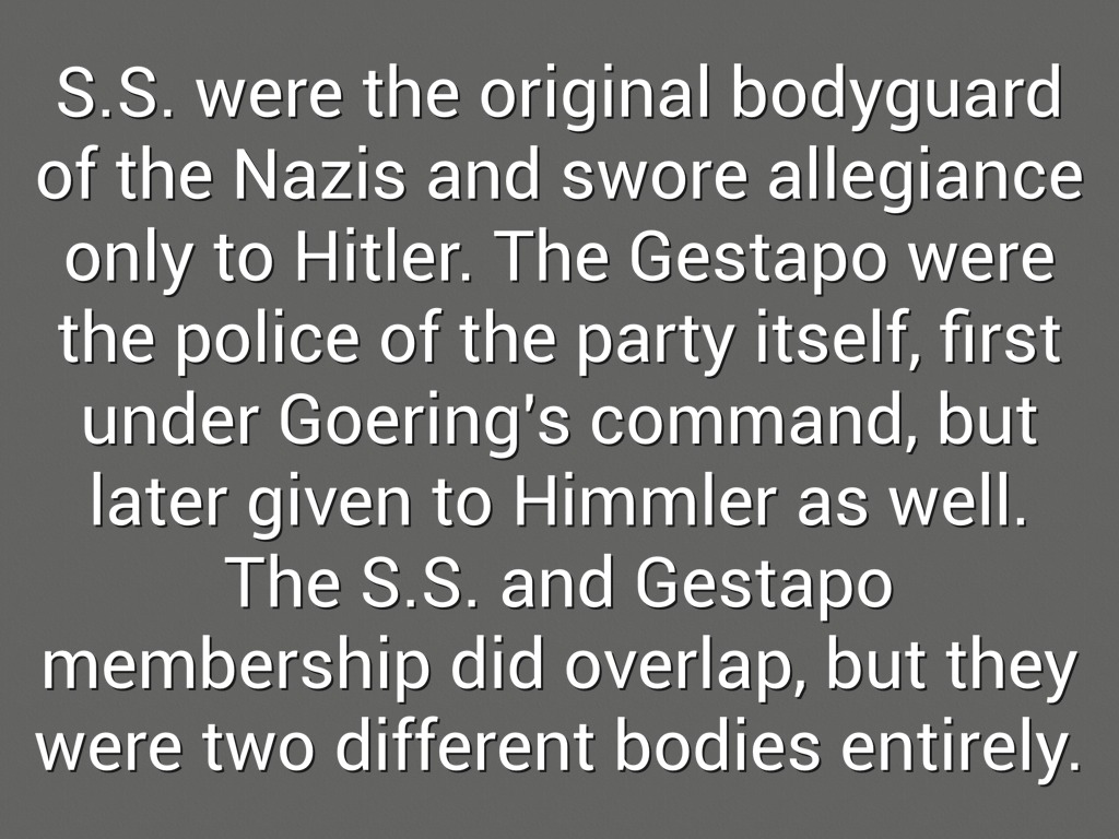 S.S. were the original bodyguard of the Nazis and swore allegiance only to Hitler. The Gestapo were the police of the party itself, first under Goering's command, but later given to Himmler as well. The S.S. and Gestapo membership did overlap, but they were two different bodies entirely.