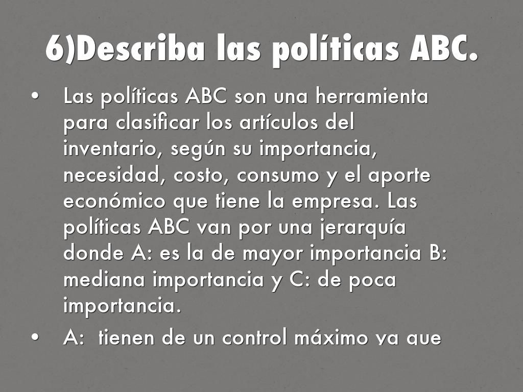 Las políticas ABC son una herramienta para clasificar los artículos del inventario, según su importancia, necesidad, costo, consumo y el aporte económico que tiene la empresa. Las políticas ABC van por una jerarquía donde A: es la de mayor importancia B: mediana importancia y C: de poca importancia.