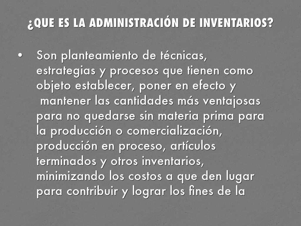 Son planteamiento de técnicas, estrategias y procesos que tienen como objeto establecer, poner en efecto y mantener las cantidades más ventajosas para no quedarse sin materia prima para la producción o comercialización, producción en proceso, artículos terminados y otros inventarios, minimizando los costos a que den lugar para contribuir y lograr los fines de la empresa.