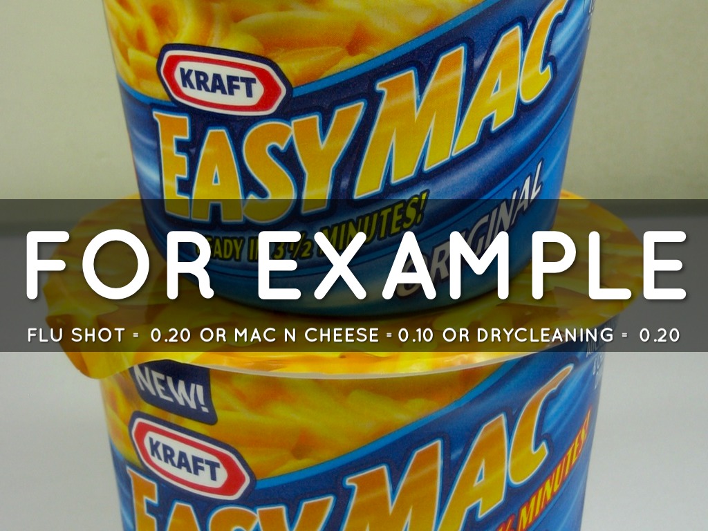 FLU SHOT = 0.20 OR MAC N CHEESE =0.10 OR DRYCLEANING = 0.20