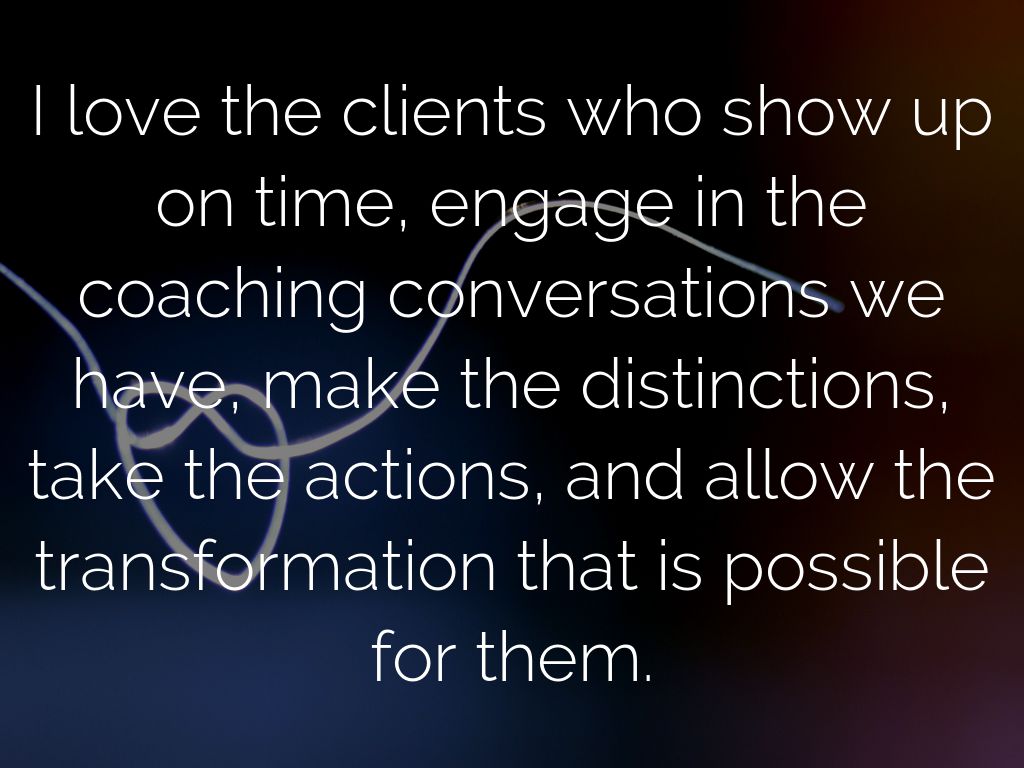 I love the clients who show up on time, engage in the coaching conversations we have, make the distinctions, take the actions, and allow the transformation that is possible for them.