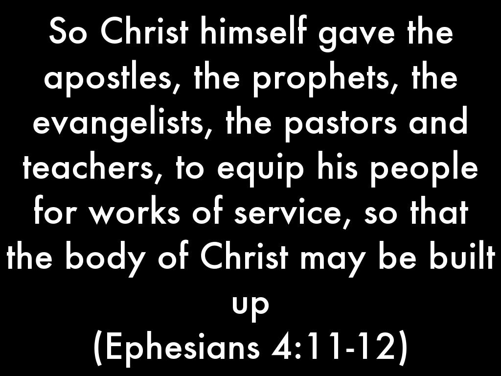 So Christ himself gave the apostles, the prophets, the evangelists, the pastors and teachers, to equip his people for works of service, so that the body of Christ may be built up