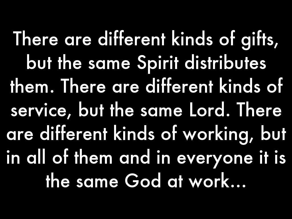 There are different kinds of gifts, but the same Spirit distributes them. There are different kinds of service, but the same Lord. There are different kinds of working, but in all of them and in everyone it is the same God at work...