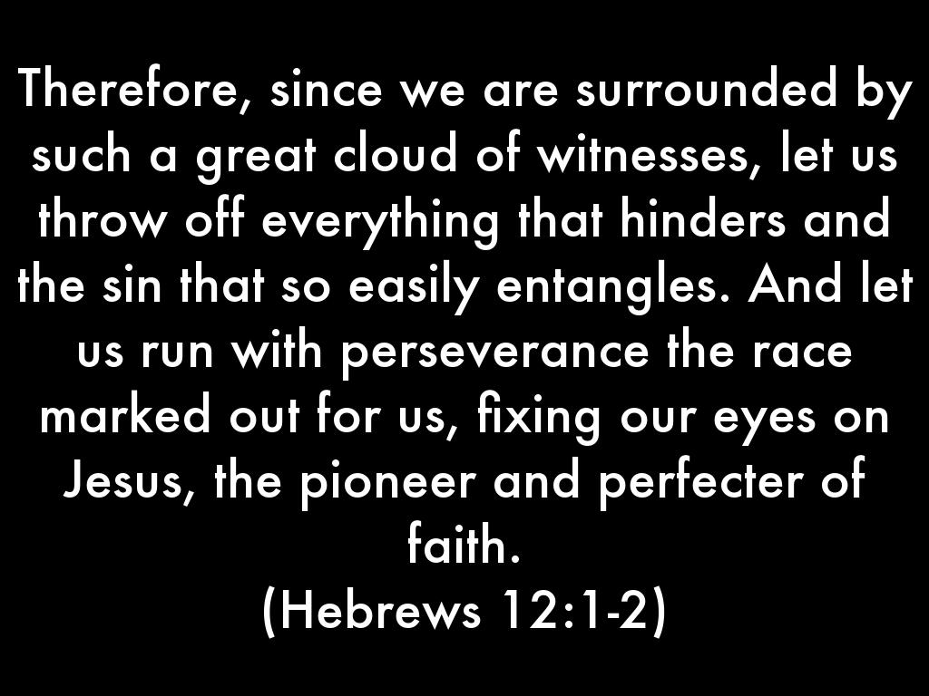 Therefore, since we are surrounded by such a great cloud of witnesses, let us throw off everything that hinders and the sin that so easily entangles. And let us run with perseverance the race marked out for us, fixing our eyes on Jesus, the pioneer and perfecter of faith.
