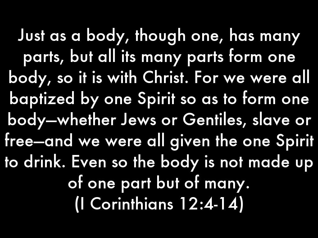 Just as a body, though one, has many parts, but all its many parts form one body, so it is with Christ. For we were all baptized by one Spirit so as to form one body—whether Jews or Gentiles, slave or free—and we were all given the one Spirit to drink. Even so the body is not made up of one part but of many.