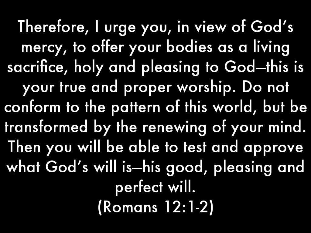 Therefore, I urge you, in view of God’s mercy, to offer your bodies as a living sacrifice, holy and pleasing to God—this is your true and proper worship. Do not conform to the pattern of this world, but be transformed by the renewing of your mind. Then you will be able to test and approve what God’s will is—his good, pleasing and perfect will.