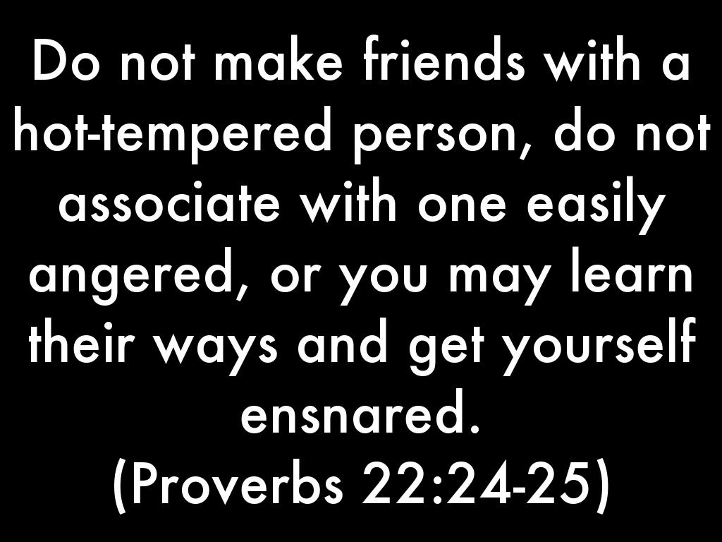 Do not make friends with a hot-tempered person, do not associate with one easily angered, or you may learn their ways and get yourself ensnared.