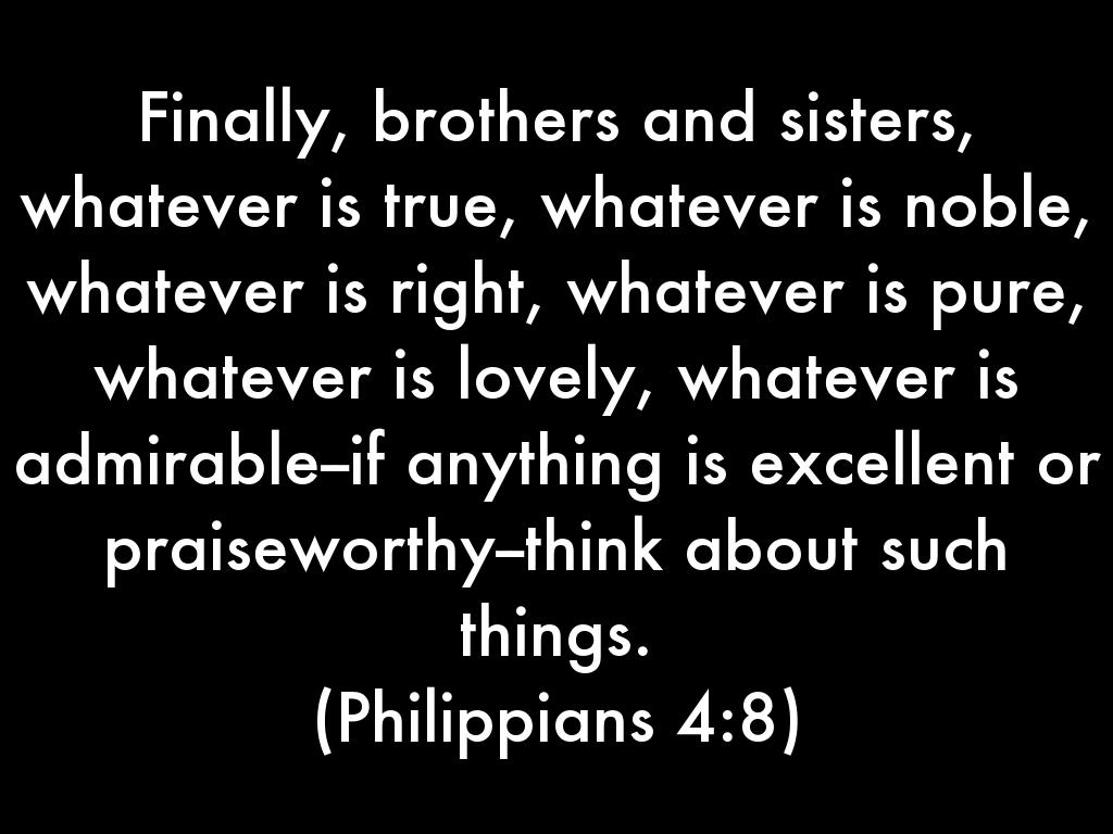 Finally, brothers and sisters, whatever is true, whatever is noble, whatever is right, whatever is pure, whatever is lovely, whatever is admirable--if anything is excellent or praiseworthy--think about such things.