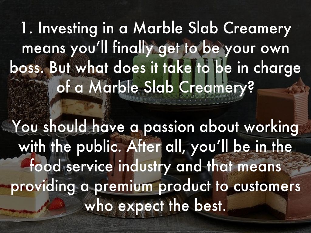 1. Investing in a Marble Slab Creamery means you’ll finally get to be your own boss. But what does it take to be in charge of a Marble Slab Creamery?