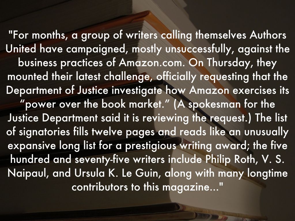 "For months, a group of writers calling themselves Authors United have campaigned, mostly unsuccessfully, against the business practices of Amazon.com. On Thursday, they mounted their latest challenge, officially requesting that the Department of Justice investigate how Amazon exercises its “power over the book market.” (A spokesman for the Justice Department said it is reviewing the request.) The list of signatories fills twelve pages and reads like an unusually expansive long list for a prestigious writing award; the five hundred and seventy-five writers include Philip Roth, V. S. Naipaul, and Ursula K. Le Guin, along with many longtime contributors to this magazine..."
