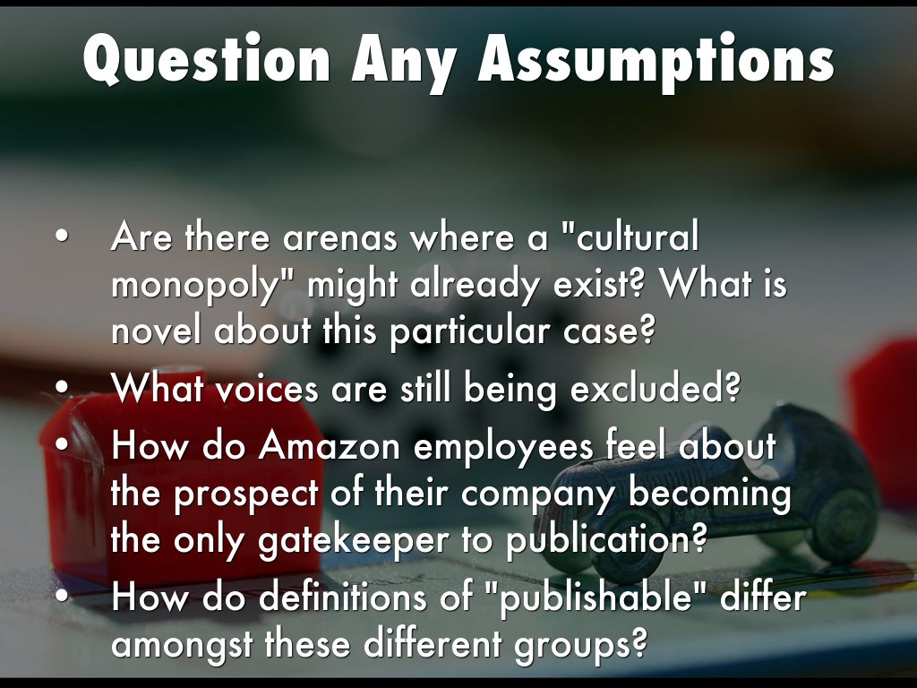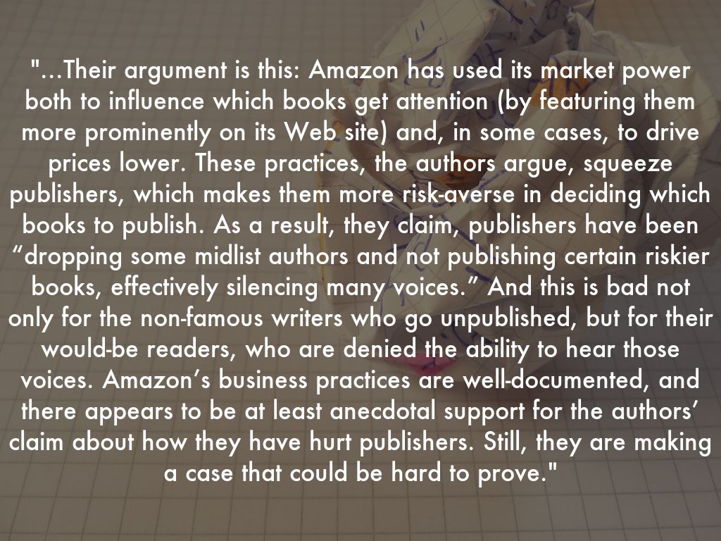 "...Their argument is this: Amazon has used its market power both to influence which books get attention (by featuring them more prominently on its Web site) and, in some cases, to drive prices lower. These practices, the authors argue, squeeze publishers, which makes them more risk-averse in deciding which books to publish. As a result, they claim, publishers have been “dropping some midlist authors and not publishing certain riskier books, effectively silencing many voices.” And this is bad not only for the non-famous writers who go unpublished, but for their would-be readers, who are denied the ability to hear those voices. Amazon’s business practices are well-documented, and there appears to be at least anecdotal support for the authors’ claim about how they have hurt publishers. Still, they are making a case that could be hard to prove."