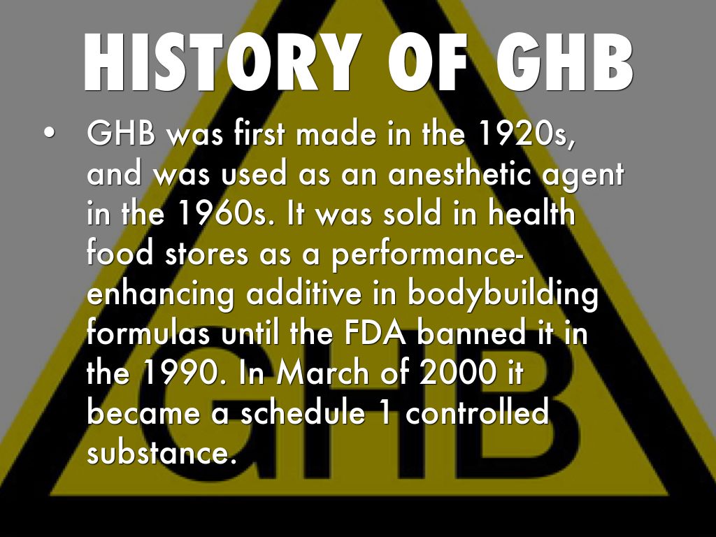 GHB was first made in the 1920s, and was used as an anesthetic agent in the 1960s. It was sold in health food stores as a performance-enhancing additive in bodybuilding formulas until the FDA banned it in the 1990. In March of 2000 it became a schedule 1 controlled substance.