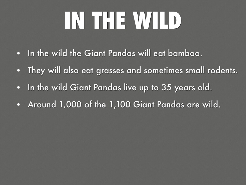 • Around 1,000 of the 1,100 Giant Pandas are wild.