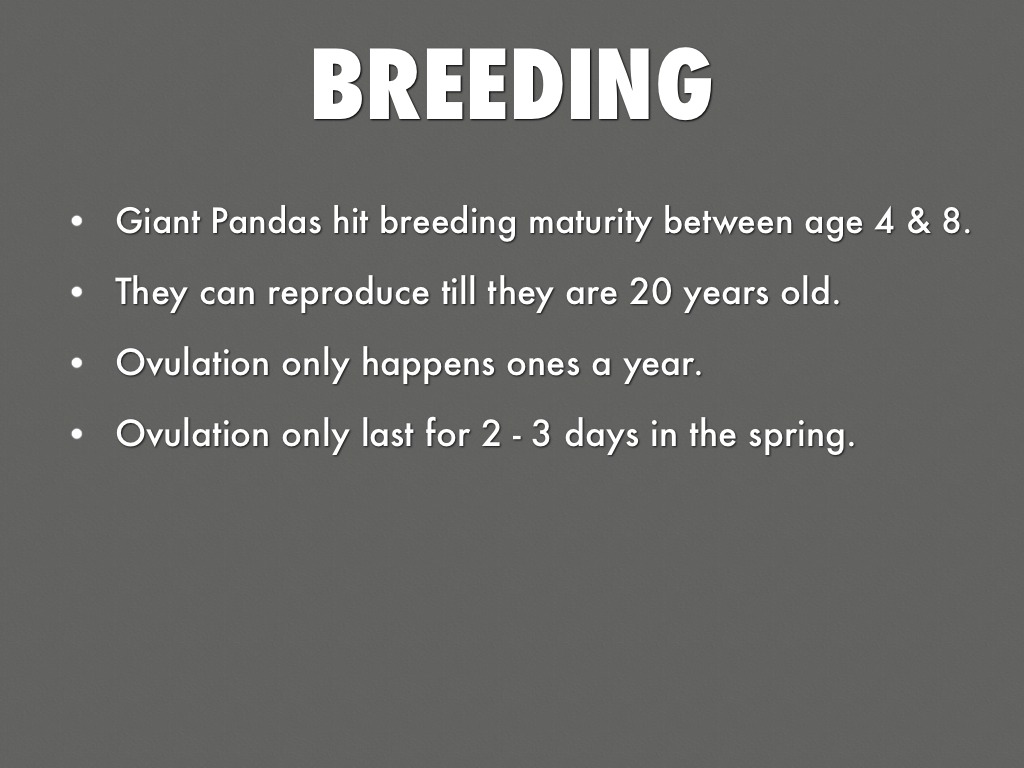 • Giant Pandas hit breeding maturity between age 4 & 8.