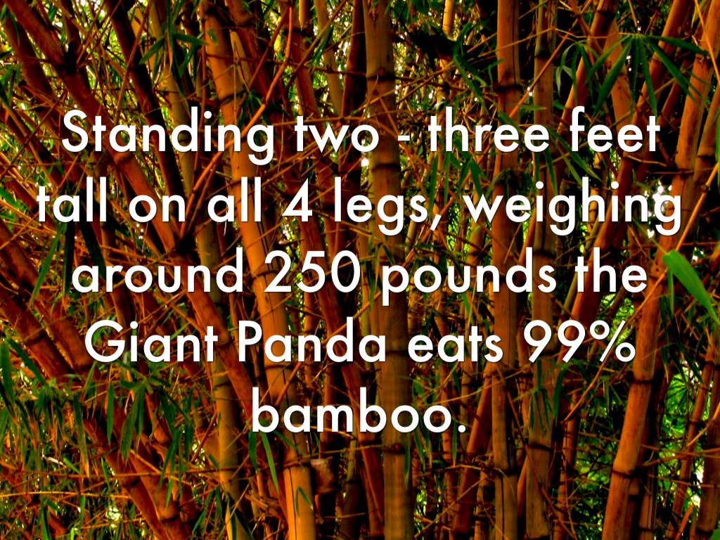 Standing two - three feet tall on all 4 legs, weighing around 250 pounds the Giant Panda eats 99% bamboo.
