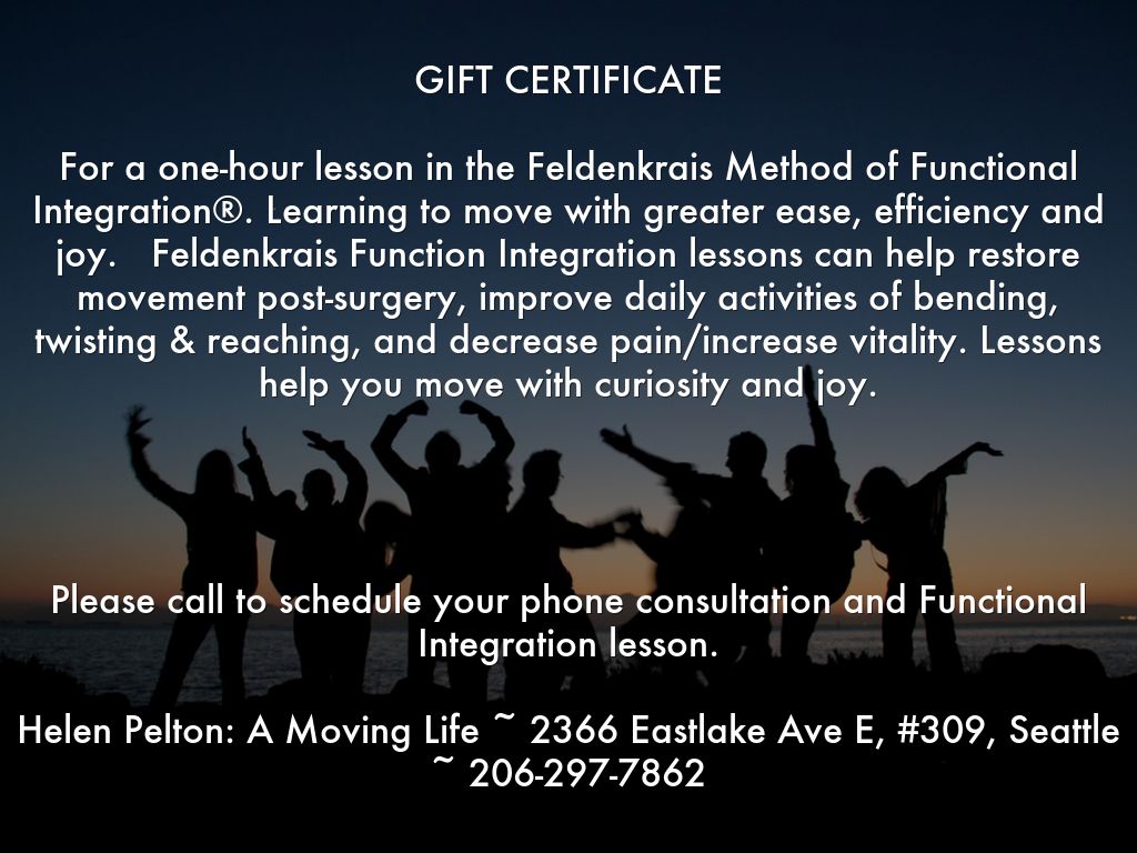 GIFT CERTIFICATE For a one-hour lesson in the Feldenkrais Method of Functional Integration®. Learning to move with greater ease, efficiency and joy. Feldenkrais Function Integration lessons can help restore movement post-surgery, improve daily activities of bending, twisting & reaching, and decrease pain/increase vitality. Lessons help you move with curiosity and joy. Please call to schedule your phone consultation and Functional Integration lesson. Helen Pelton: A Moving Life ~ 2366 Eastlake Ave E, #309, Seattle ~ 206-297-7862