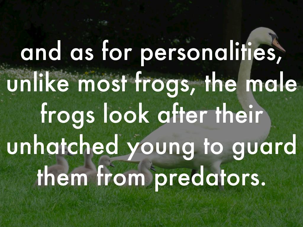 and as for personalities, unlike most frogs, the male frogs look after their unhatched young to guard them from predators.
