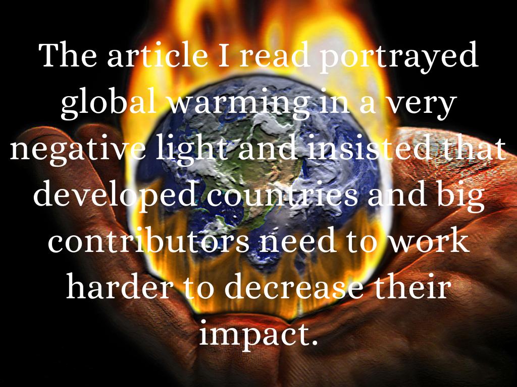 The article I read portrayed global warming in a very negative light and insisted that developed countries and big contributors need to work harder to decrease their impact.