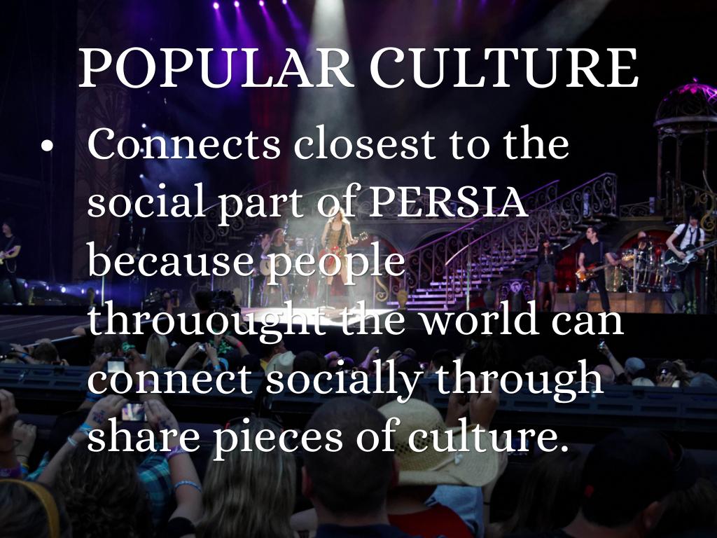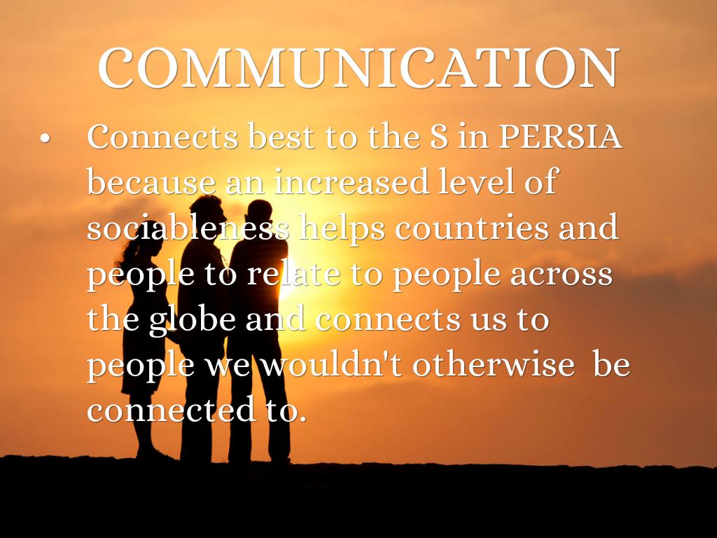 Connects best to the S in PERSIA because an increased level of sociableness helps countries and people to relate to people across the globe and connects us to people we wouldn't otherwise be connected to.
