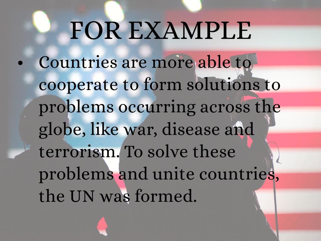 Countries are more able to cooperate to form solutions to problems occurring across the globe, like war, disease and terrorism. To solve these problems and unite countries, the UN was formed.