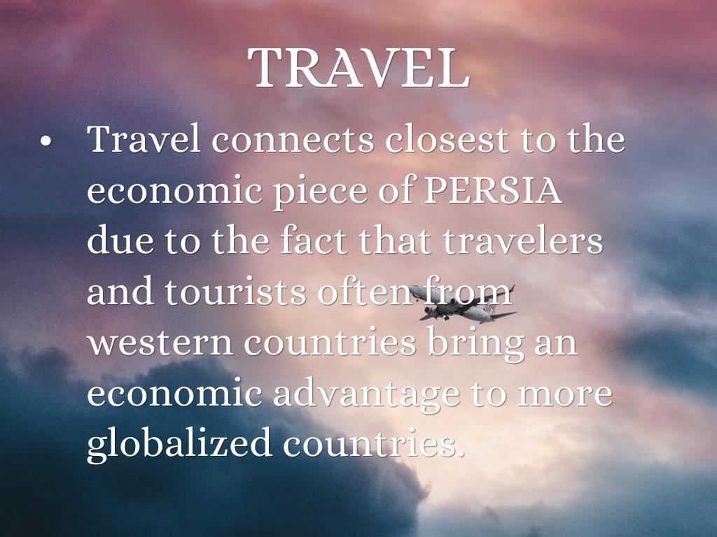 Travel connects closest to the economic piece of PERSIA due to the fact that travelers and tourists often from western countries bring an economic advantage to more globalized countries.
