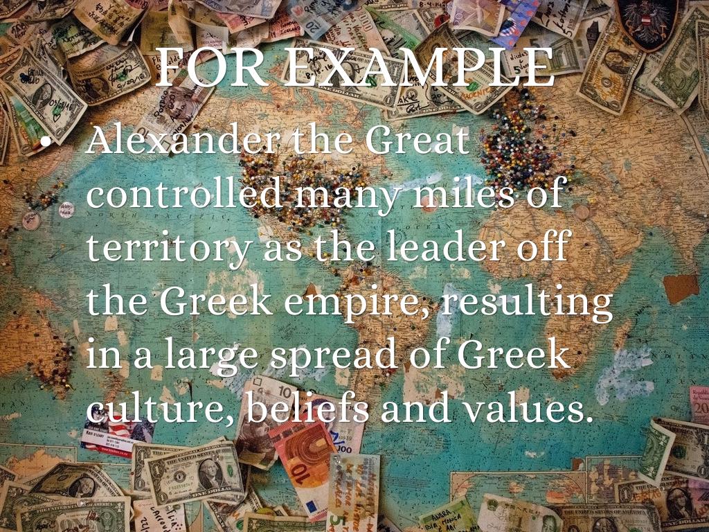 Alexander the Great controlled many miles of territory as the leader off the Greek empire, resulting in a large spread of Greek culture, beliefs and values.