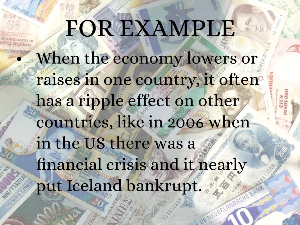 When the economy lowers or raises in one country, it often has a ripple effect on other countries, like in 2006 when in the US there was a financial crisis and it nearly put Iceland bankrupt.