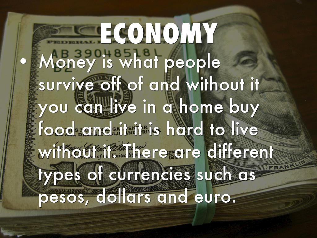 Money is what people survive off of and without it you can live in a home buy food and it it is hard to live without it. There are different types of currencies such as pesos, dollars and euro.