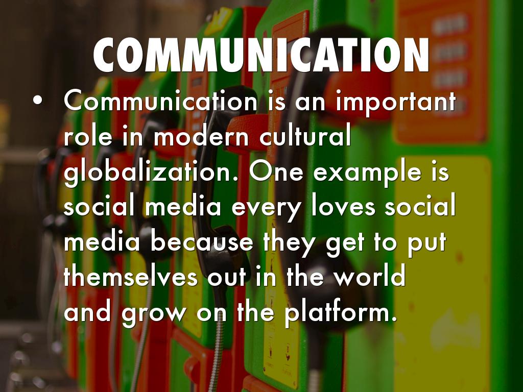Communication is an important role in modern cultural globalization. One example is social media every loves social media because they get to put themselves out in the world and grow on the platform.