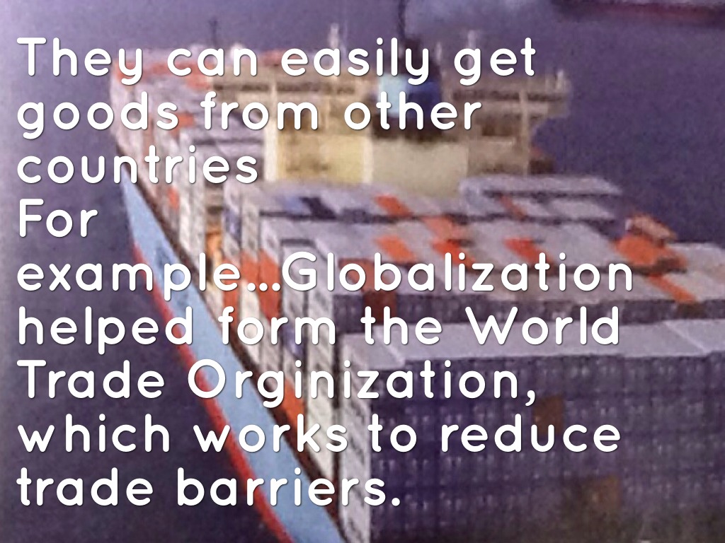 For example...Globalization helped form the World Trade Orginization, which works to reduce trade barriers.