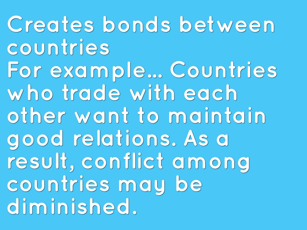For example... Countries who trade with each other want to maintain good relations. As a result, conflict among countries may be diminished.