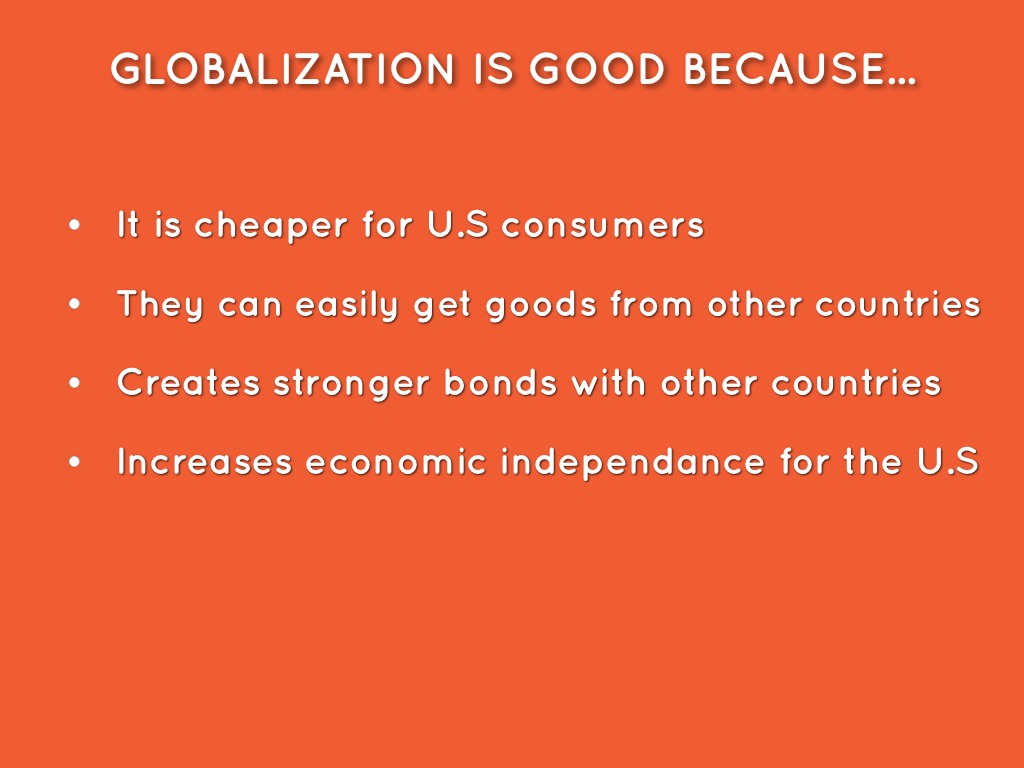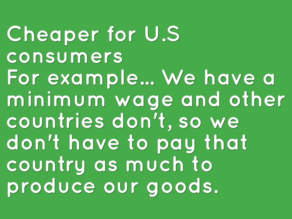 For example... We have a minimum wage and other countries don't, so we don't have to pay that country as much to produce our goods.