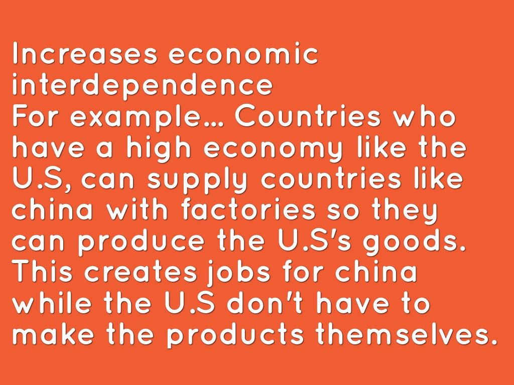 For example... Countries who have a high economy like the U.S, can supply countries like china with factories so they can produce the U.S's goods. This creates jobs for china while the U.S don't have to make the products themselves.