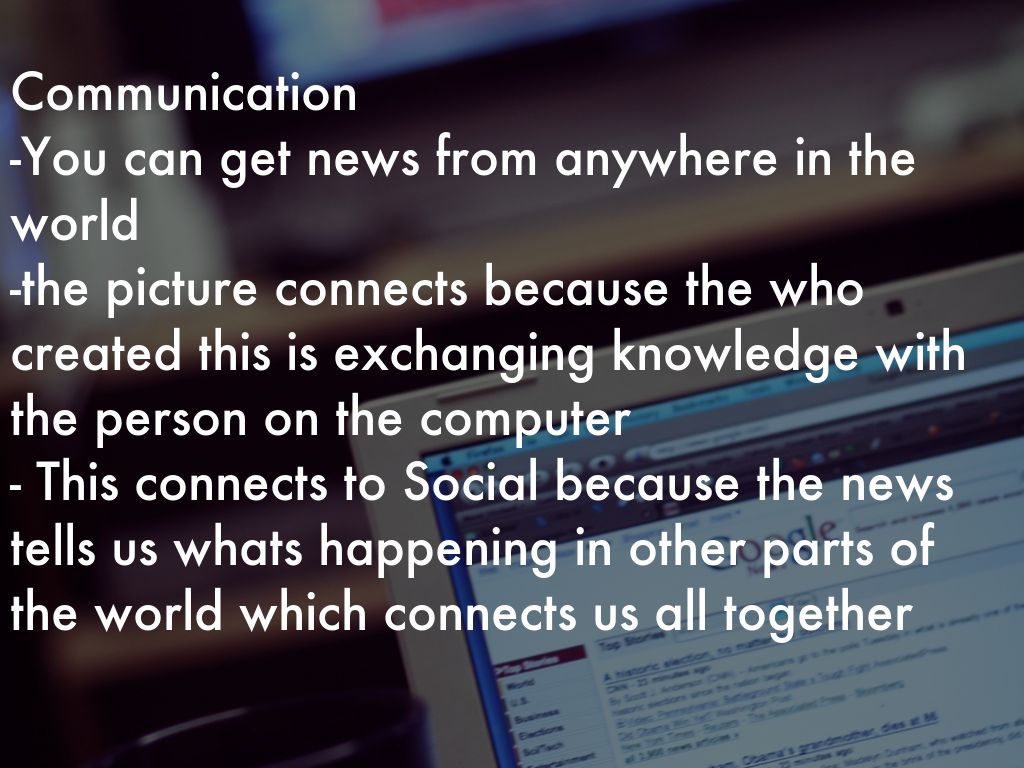 Communication -You can get news from anywhere in the world -the picture connects because the who created this is exchanging knowledge with the person on the computer - This connects to Social because the news tells us whats happening in other parts of the world which connects us all together