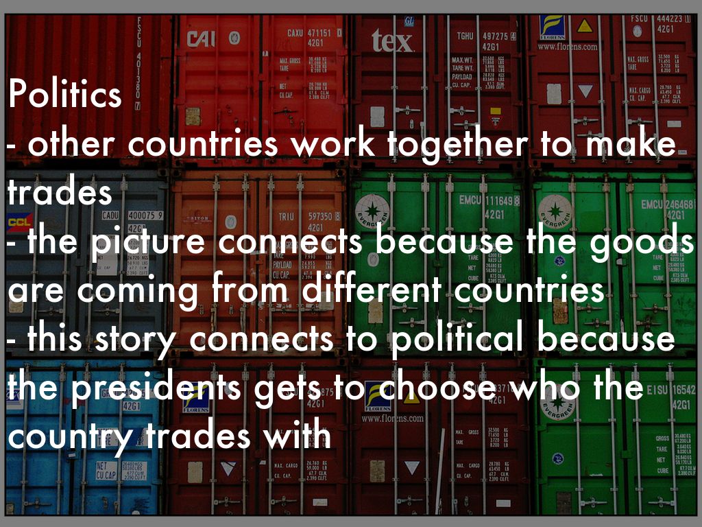 Politics - other countries work together to make trades - the picture connects because the goods are coming from different countries - this story connects to political because the presidents gets to choose who the country trades with