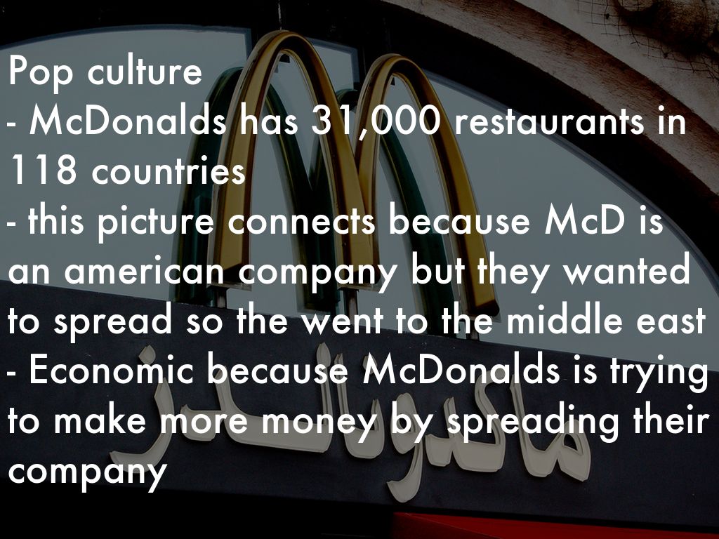 Pop culture - McDonalds has 31,000 restaurants in 118 countries - this picture connects because McD is an american company but they wanted to spread so the went to the middle east - Economic because McDonalds is trying to make more money by spreading their company