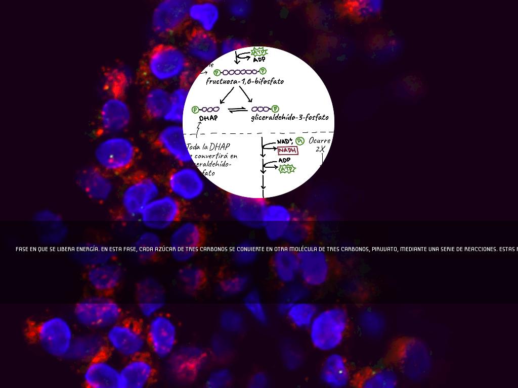 Fase en que se libera energía. En esta fase, cada azúcar de tres carbonos se convierte en otra molécula de tres carbonos, piruvato, mediante una serie de reacciones. Estas reacciones producen dos moléculas de ATPATPstart text, A, T, P, end text y una de NADHNADHstart text, N, A, D, H, end text. Dado que esta fase ocurre dos veces, una por cada dos azúcares de tres carbonos, resultan cuatro moléculas de ATPATPstart text, A, T, P, end text y dos de NADHNADHstart text, N, A, D, H, end text en total.