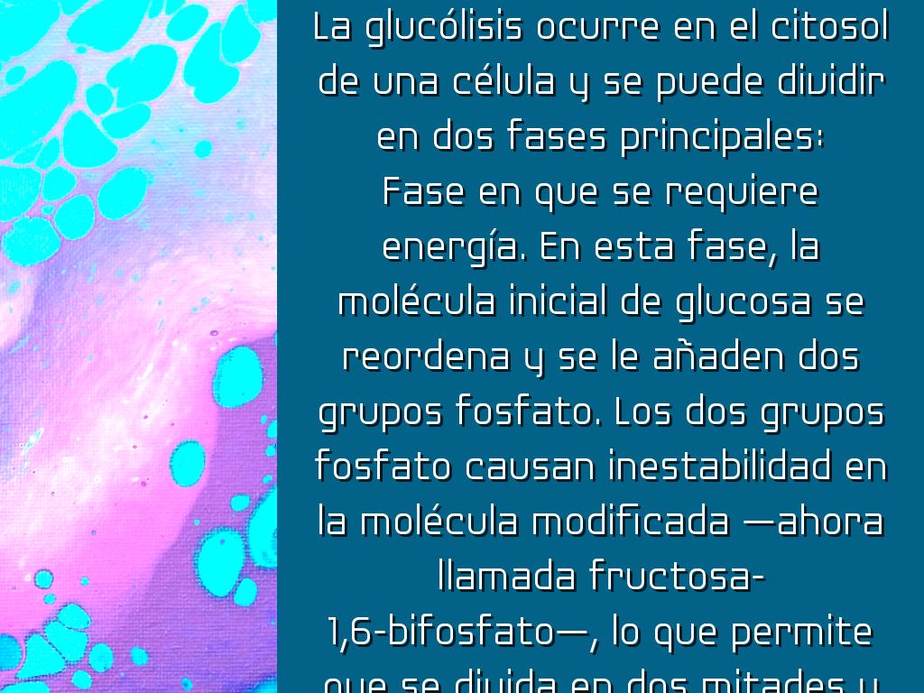 La glucólisis ocurre en el citosol de una célula y se puede dividir en dos fases principales: