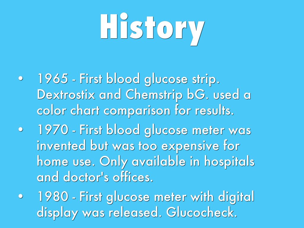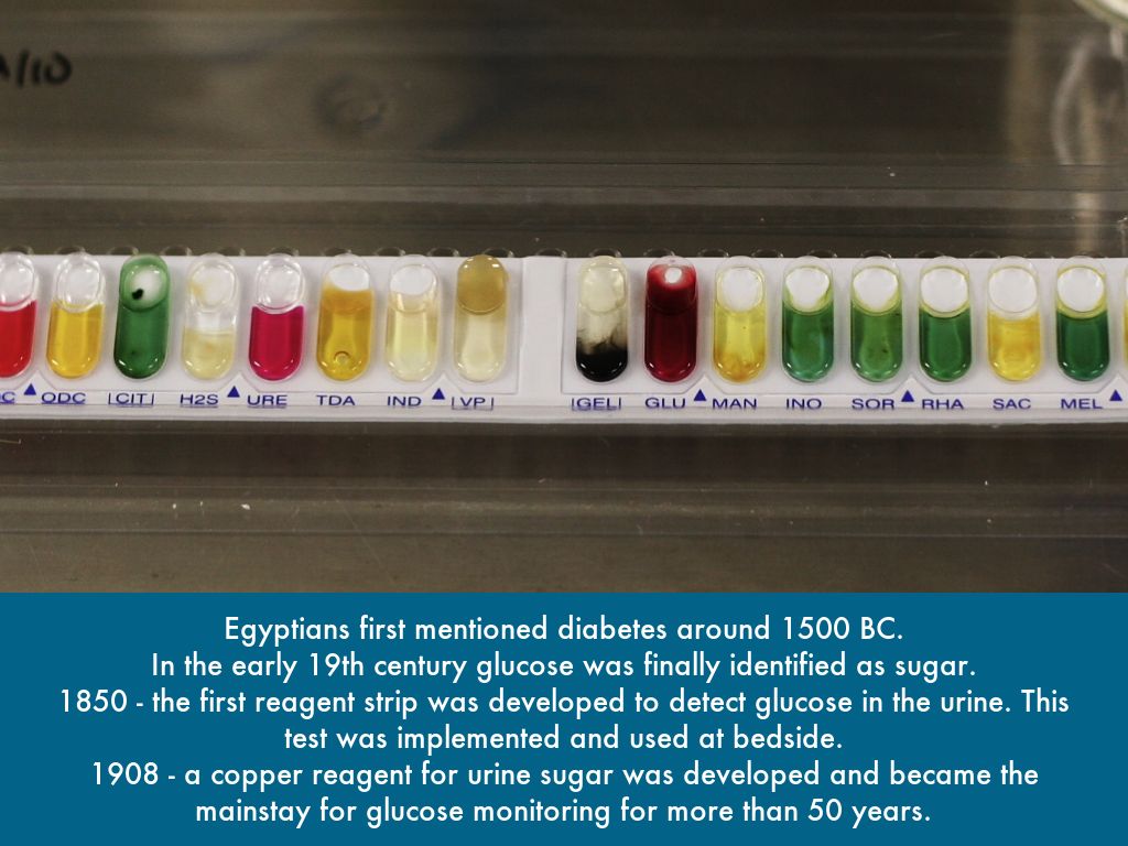 Egyptians first mentioned diabetes around 1500 BC. In the early 19th century glucose was finally identified as sugar. 1850 - the first reagent strip was developed to detect glucose in the urine. This test was implemented and used at bedside. 1908 - a copper reagent for urine sugar was developed and became the mainstay for glucose monitoring for more than 50 years.