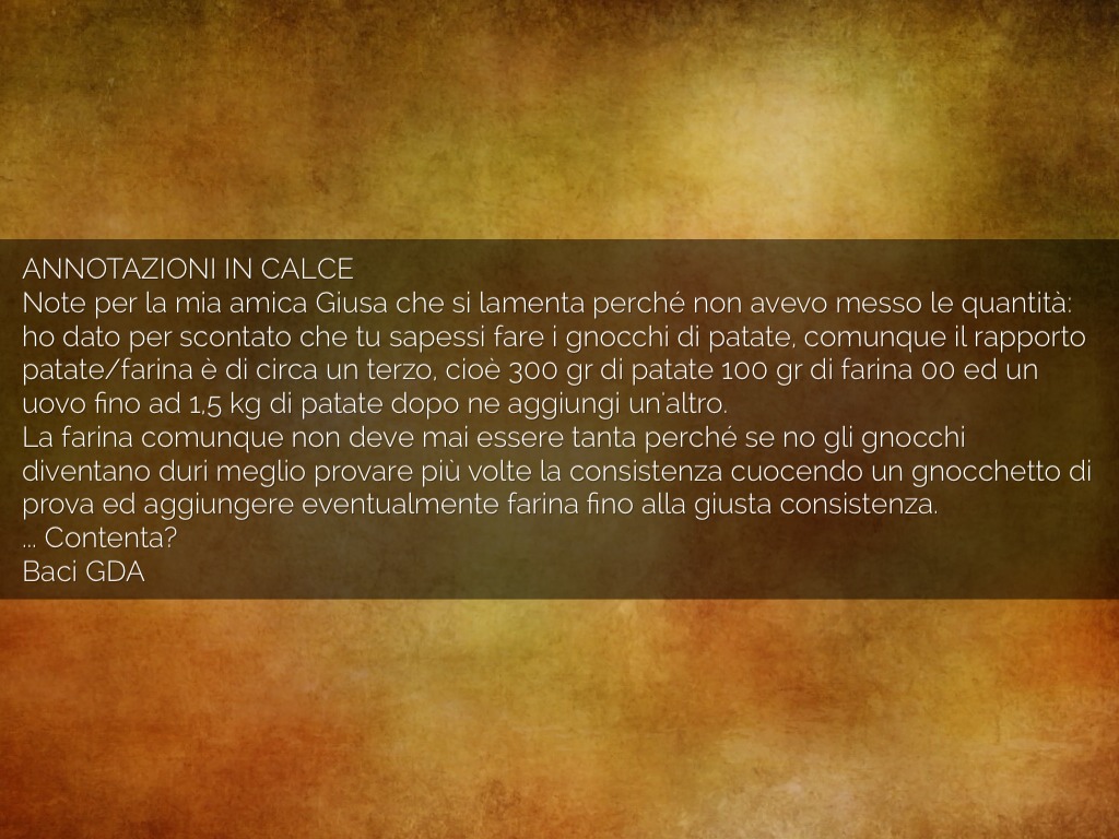 Note per la mia amica Giusa che si lamenta perché non avevo messo le quantità: ho dato per scontato che tu sapessi fare i gnocchi di patate, comunque il rapporto patate/farina è di circa un terzo, cioè 300 gr di patate 100 gr di farina 00 ed un uovo fino ad 1,5 kg di patate dopo ne aggiungi un'altro.