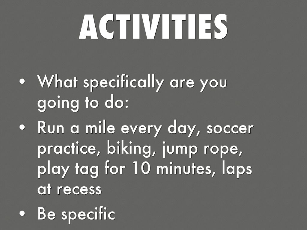 Run a mile every day, soccer practice, biking, jump rope, play tag for 10 minutes, laps at recess