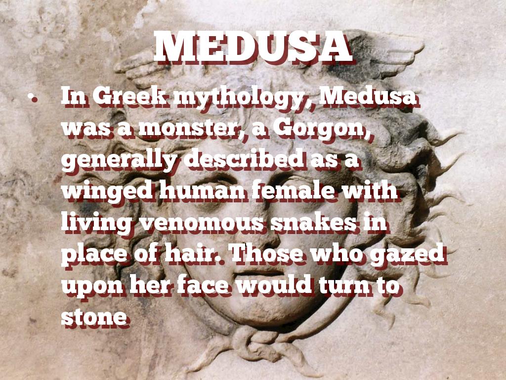 In Greek mythology, Medusa was a monster, a Gorgon, generally described as a winged human female with living venomous snakes in place of hair. Those who gazed upon her face would turn to stone