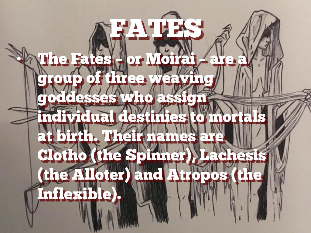 The Fates – or Moirai – are a group of three weaving goddesses who assign individual destinies to mortals at birth. Their names are Clotho (the Spinner), Lachesis (the Alloter) and Atropos (the Inflexible).