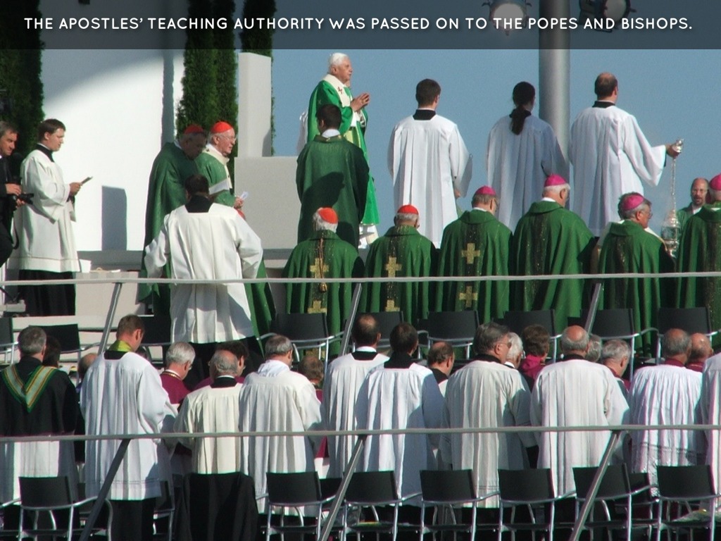 THE APOSTLES’ TEACHING AUTHORITY WAS PASSED ON TO THE POPES AND BISHOPS.